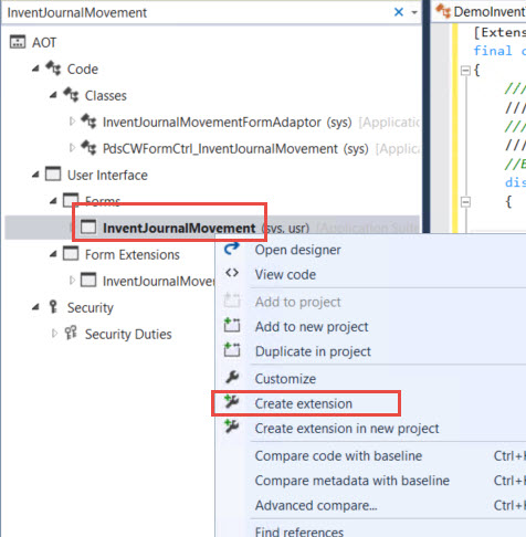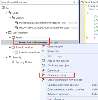4. Now find the 'InventJournalMovement' form in AOT and create an Extension