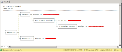 I remembered an old article which I came through long time ago written by MVP Brad Schulz, he developed a legendary stored procedure (usp_DrawTable) that technically analyzes such relations and populate it graphically through SQL. It is one of the thing that I have read and would never forget as it is definitely a piece of art. So I decided to use his master piece in presenting the approval hierarchy graphically through SQL.The article can be found on this link, and the stored procedure can be found on ups_DrawTable.