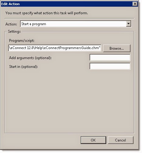 To validate this, I performed a simple test. I setup a new task in Windows Task Scheduler that would simply launch the Dynamics GP eConnect Programmers Guide, which is a .chm help file. I did this because Task Scheduler allows you to run an application in your user session, or as a system task that does not require you to be logged in--this runs it in a "nether world" similar to running as a Windows Service.