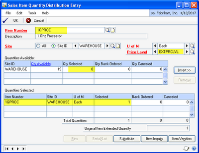 When entering the primary item in Sales Transaction Entry, in this case 1-A3483A, if there isn't enough stock available to satisfy the transaction quantity, the Sales Quantity Shortage Options window opens as you tab off the Quantity field in the Sales document. Select 'Distribute' as the Shortage Option and click 'OK'.