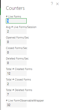 Forms: It shows how many forms are currently opened, opened/second, closed per second and a set of other counters like the total amount of created forms or closed forms.