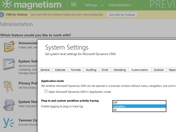 Microsoft Dynamics CRM 2015 Update 1 has introduced a new feature for developers to troubleshoot plugins more efficiently when using ITracingService. This feature allows developers to record tracing information from the Trace() method invoked from Plugins or custom Workflows. The recorded information is stored in a new system entity called Plug-in Trace Logs which you can get to from the Settings area or Advanced Find.