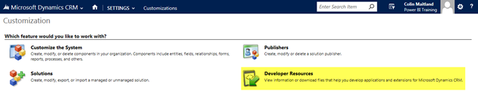 - From your Microsoft Dynamics CRM Online Organisation, navigate to SETTINGS, Customisations and select Developer Resources from the list of features.