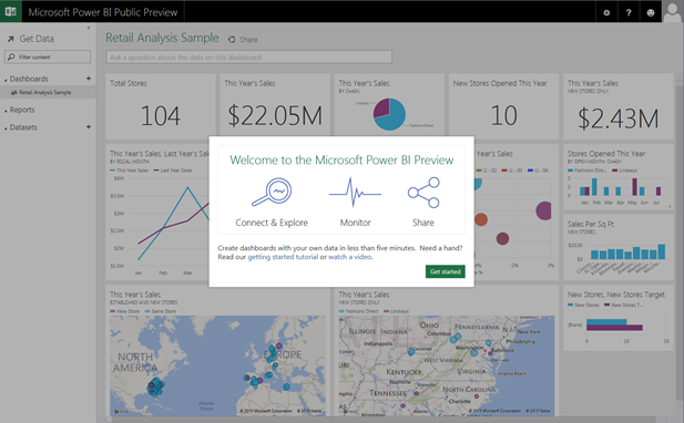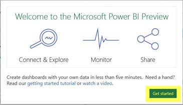 - If required, click Get started to close the Welcome to the Microsoft Power BI Preview dialog.