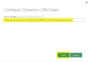 - At the first page of the Configure Dynamics CRM Sales dialog, enter the Organisation Data Service URL previously copied from your Microsoft Dynamics CRM Online Organisation; e.g. https://powerbitraining.crm6.dynamics.com/XRMServices/2011/OrganizationData.svc and then click Next to continue.