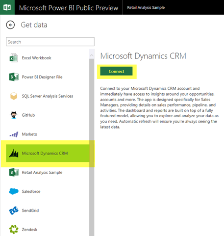 - The Microsoft Power BI Preview will now connect to your Microsoft Dynamics CRM Online