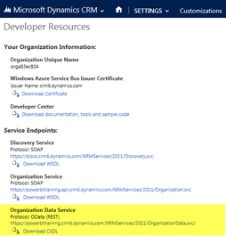 - From the Developer Resources Area locate and copy the Organisation Data Service URL; e.g. https://powerbitraining.crm6.dynamics.com/XRMServices/2011/OrganizationData.svc.