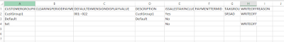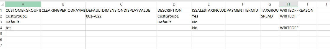 Below is the file format for customer groups uploading process through entities. For dimension value we are using format Dimension1-Dimension2-Dimension3.