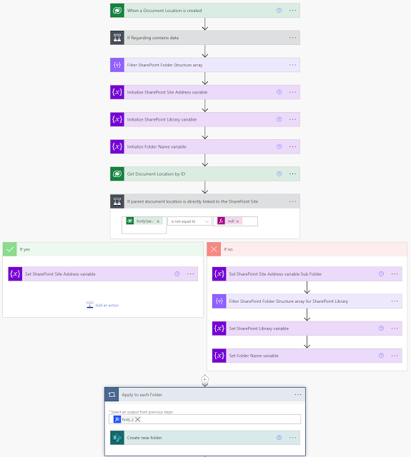 This query is a bit complicated. This step is not only to get the value for SharePoint Site Address variable but also to retrieve the whole folder path if the current document location is created inside the related Contact or Account folder as mentioned in Part 3.