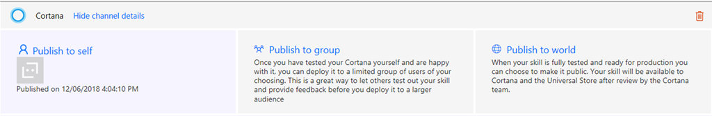 On the channel settings there’s also a manage button which takes you to the Cortana Skills site (https://www.knowledge.store). If it’s your first time here, you’ll be given a walkthrough and prompted to create your first organization/botlet. You can skip this and go straight to your workspace which at this point should contain your bot framework bot. From the workspace area you can manage your existing Cortana Skills and even create new ones. By selecting the existing bot we created in Azure and navigating to the Publish tab, we can check the details of the skill and even have the option to publish it to a group or the world.