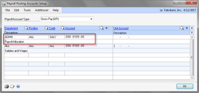 So, in the case of the screenshot above, we are allocating Gross Wages. We have specified that for the ADMIN department, any wages that use the SALY pay code will post to our fixed allocation account 000-5109-000. Now, as you can imagine, if you have different allocation breakdowns (which would required different fixed allocation accounts) then you need to consider how you can set up your payroll posting accounts to route the wages to the proper fixed allocation account. For example, you might have differnet percentages based on department or based on pay code or based on position.