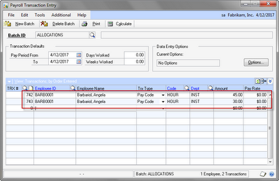 When allocating by hours worked, it is a fairly straightforward process. For example, if I needed to allocate an hourly employee to two different departments, I would record the two time entries individually as follows in Payroll Transaction Entry (Transactions-Payroll-Transaction Entry):