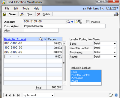 The Fixed Allocation Account itself must be a unique account number, and then under Distribution Account you enter the posting accounts and percentages to be used. Once you have the Fixed Allocation Account setup, you would need to use it in your Payroll Posting Accounts Setup (Microsoft Dynamics GP-Tools-Setup-Posting-Payroll Accounts):