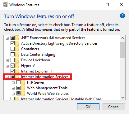 2. In the Windows Features window, locate and expand Internet Information Services.