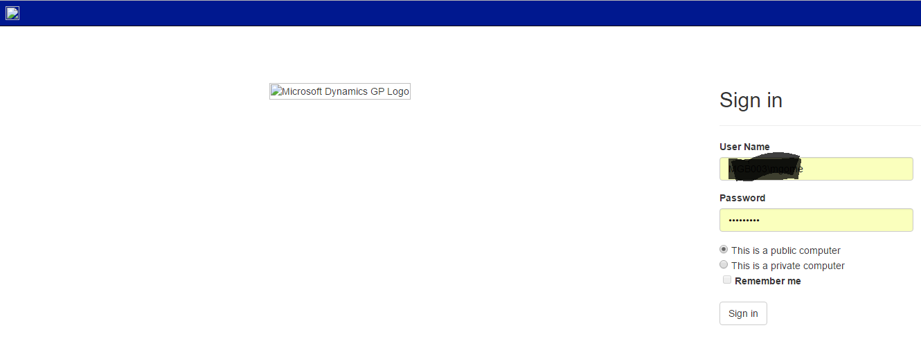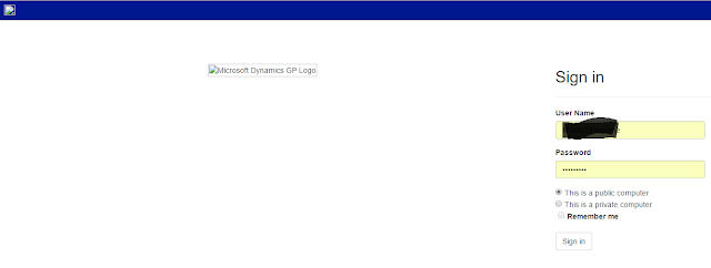 | Microsoft Dynamics GP Sign In page (Sessions) |