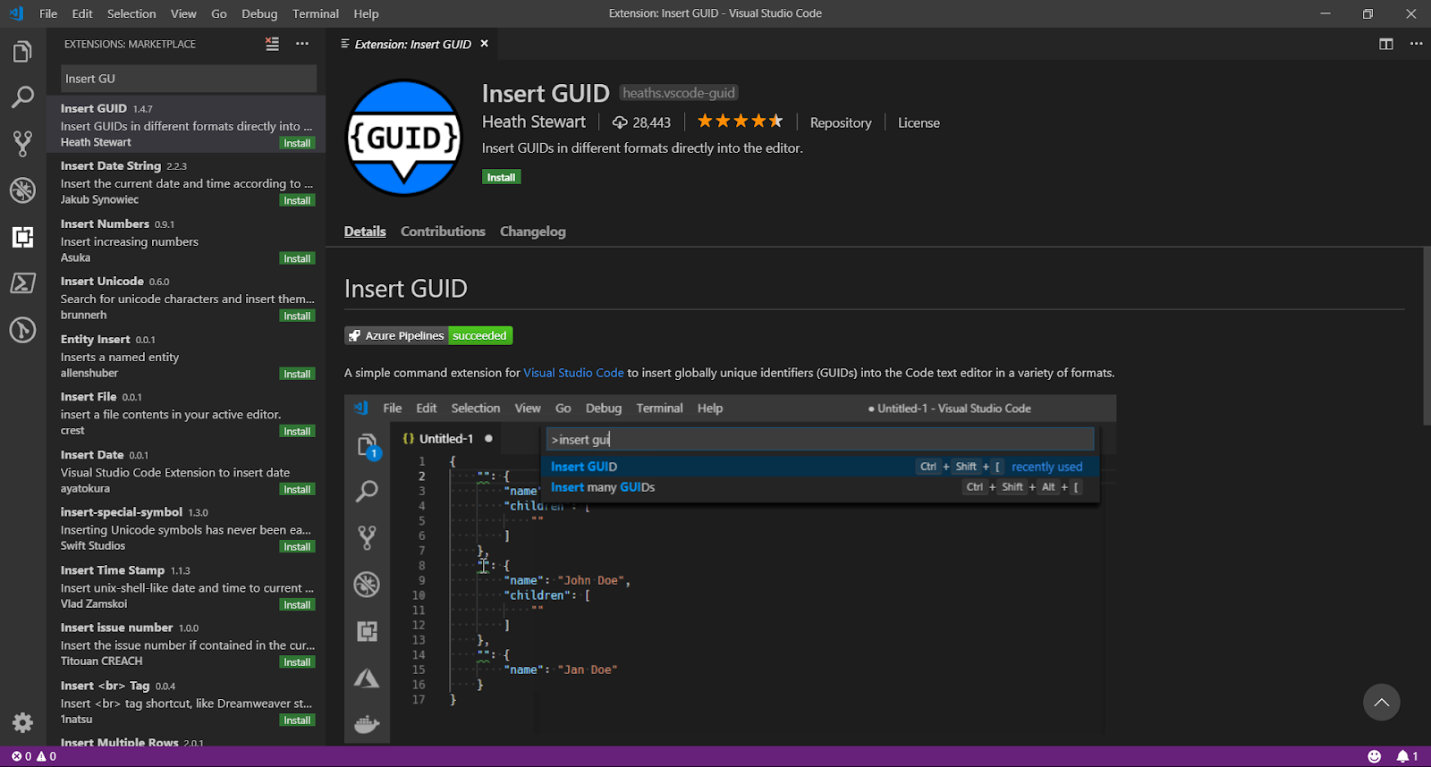 4. Install Insert GUID by Heath Stewart. Insert GUID is a simple command extension for Visual Studio Code to insert globally unique identifiers (GUIDs) into the Code text editor in a variety of formats.
