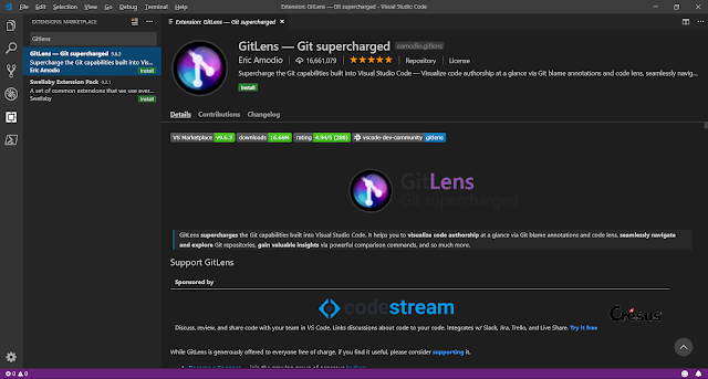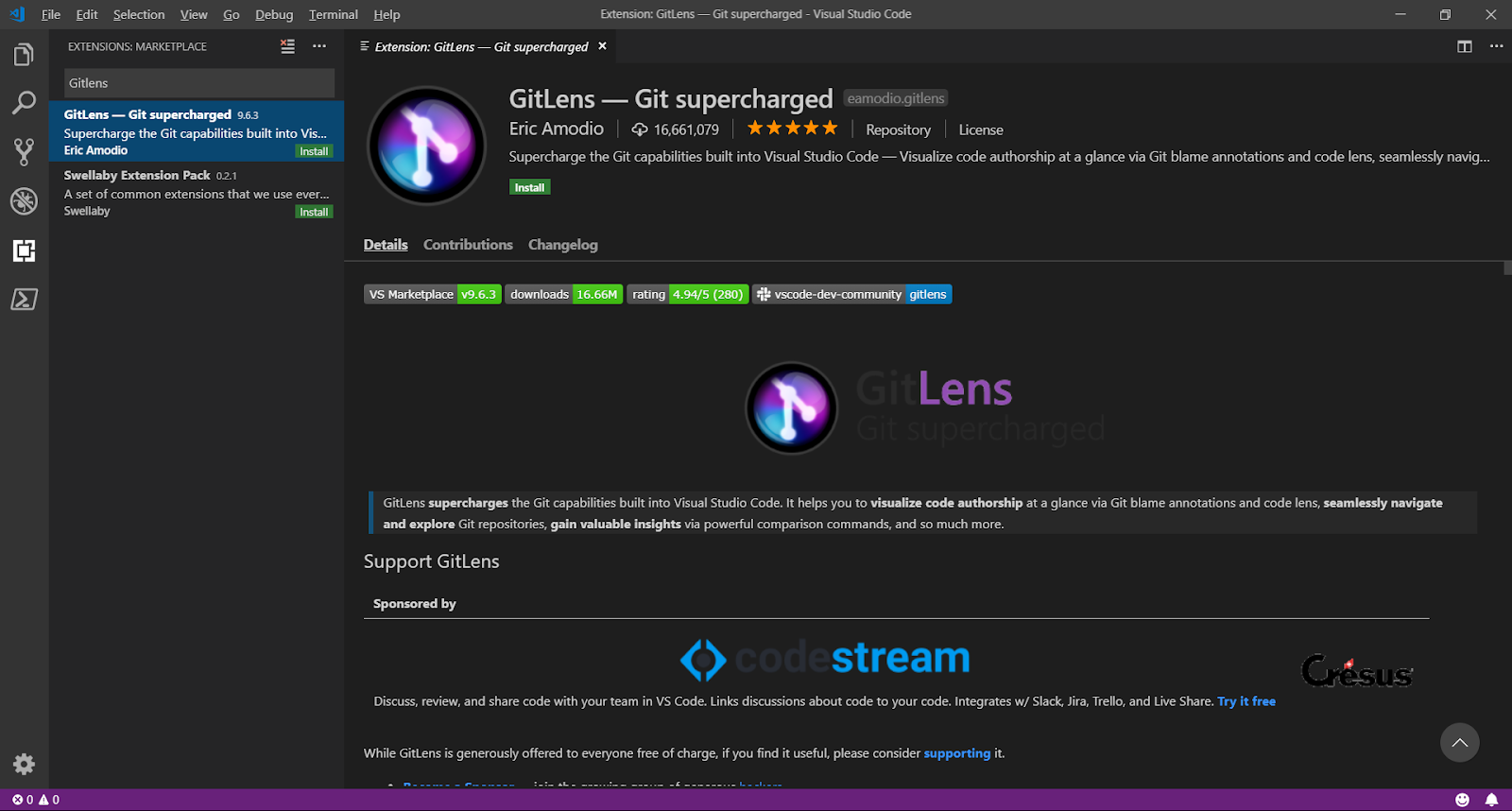 3. Install GitLens by Eric Armodio. Following similar process, click on the Extension button and type GitLens. With GitLens you can visualize code authorship at a glance via Git blame annotations and code lens, seamlessly navigate and explore Git repositories, gain insights via powerful comparison commands, and much more.