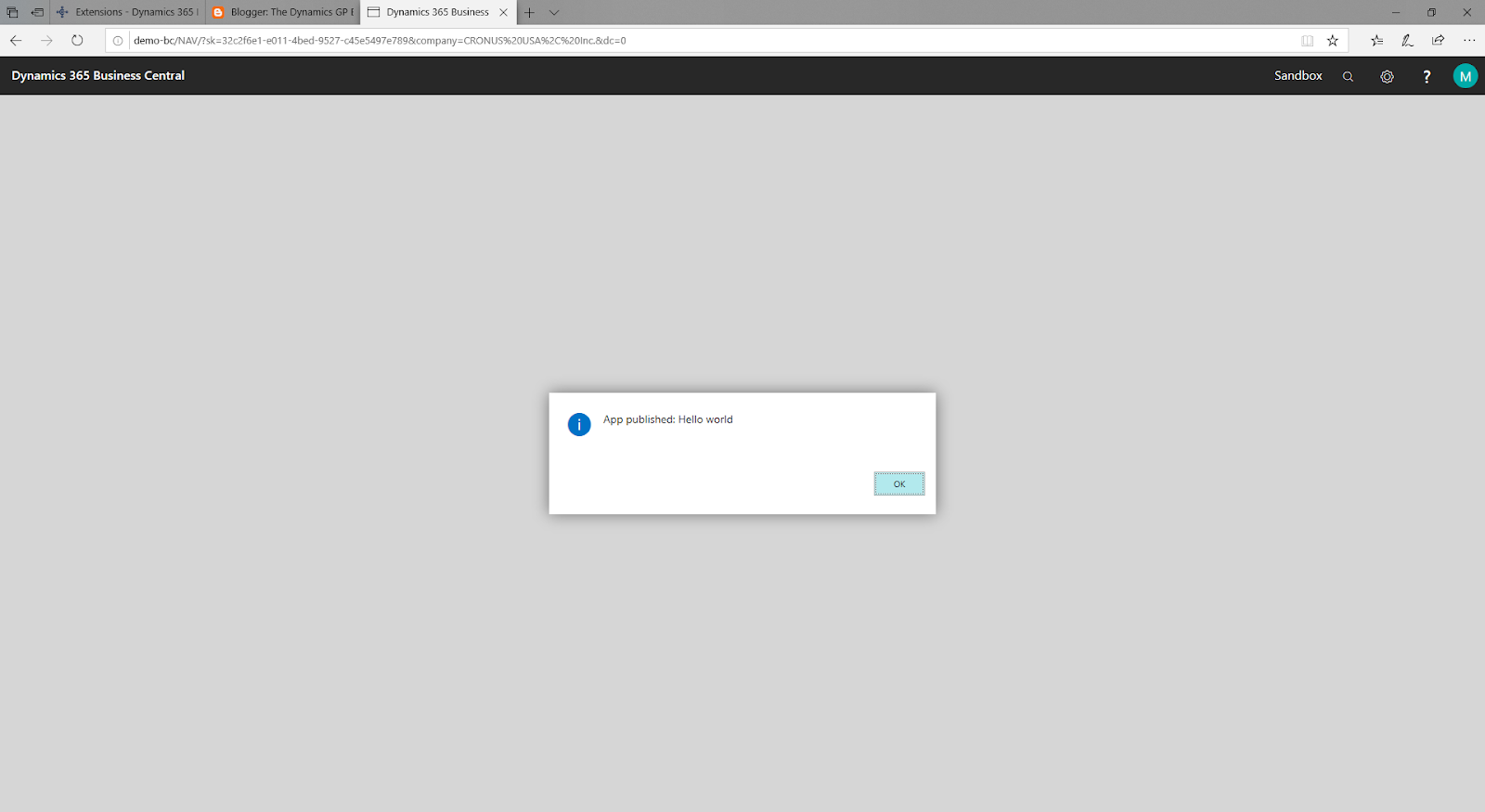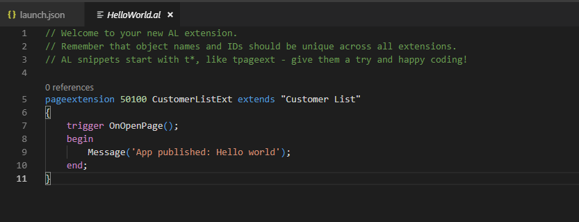 This extension simply sets a trigger to the OnOpenPage() event of the Customer List page that displays the message "App published: Hello word". The page is loaded by default as specified in the launch.json file.