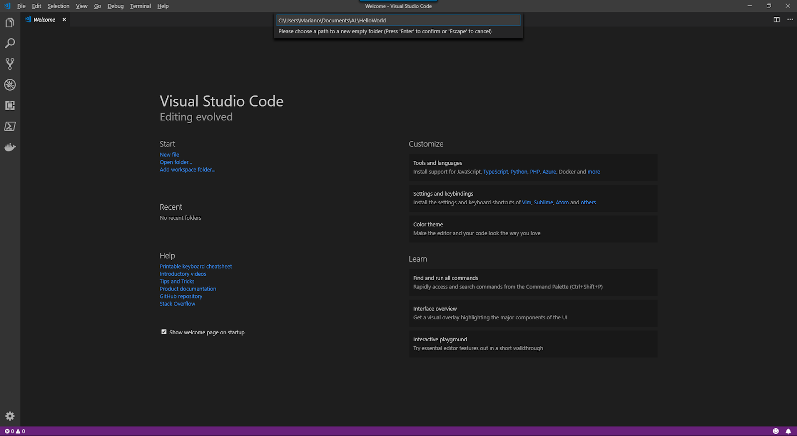 2. Enter a local folder where you would like to store the project. In this case, I simply removed the last portion of the folder name and replaced with HelloWorld.