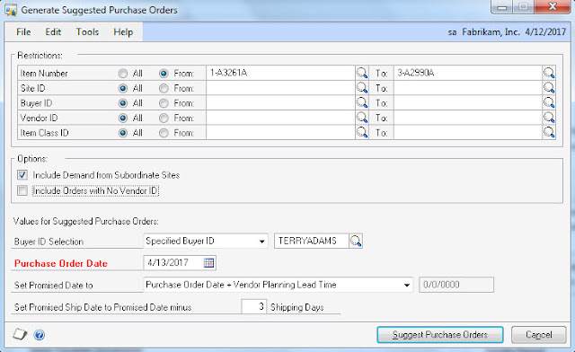 Essentially, PO Gen scans Available Quantity for the items and sites selected in the Generate Suggest Purchase Orders window, compares that quantity to the desired stocking level (Required Quantity) as set in the Resource Planning windows and suggests purchase orders where the Available Quantity is less than the Required Quantity. The suggested purchase quantity is based on values set in the Resource Planning windows. (For more information on how to determine these values, see Help files for Purchase Order Generator and Item Resource Planning).