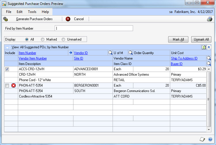 When you run PO Gen, the Suggested Purchase Orders Preview window reflects suggested POs to replenish items per your order policies.