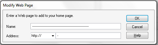 To create a divider line you need to add a web page shortcut to your QuickLinks pane. In the Name field on the Add Web Page box you should put in whatever you want to appear as the divider. For our example I will use a string of hyphen characters (-----). For the address, select either http:// or https://, it does not matter which. In the name field to the right of the address simply type in a hyphen.