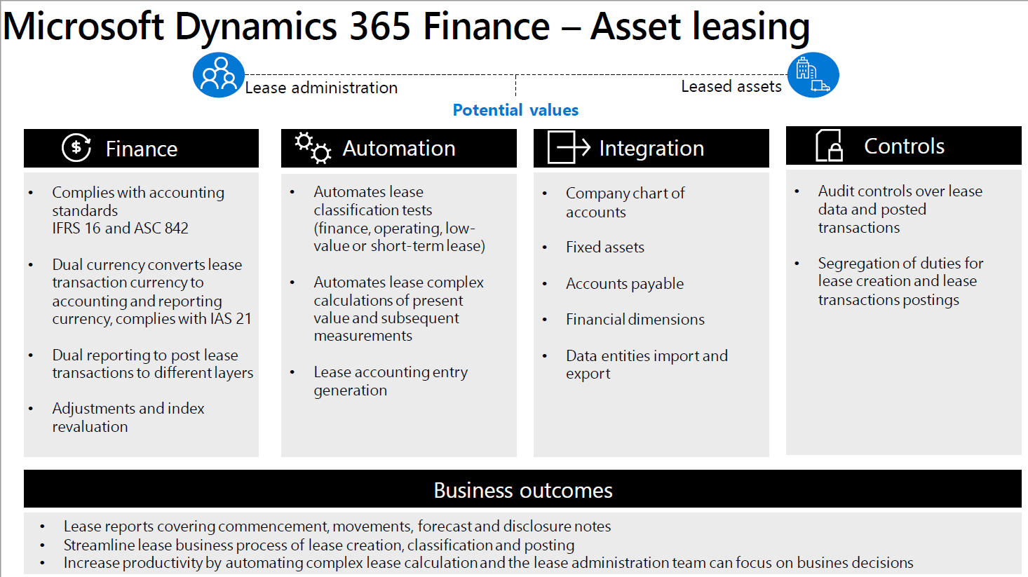 Asset leasing helps you adapt and be compliant to the ASC 842 and IFRS 16 accounting regulations related to lease management and its financial impact Asset leasing is integrated with fixed assets and the chart of accounts. Refer to Microsoft Tech talk on this topic having feature demonstration here.