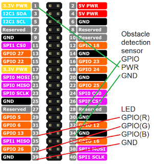 Obstacle detection sensor GPIO 12 <-> OUT 3.3V <-> + GND <-> GND LED GPIO 13 <-> R GPIO 26 <-> G GPIO 16 <-> B GND <-> - |