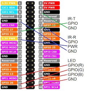 Infrared transmitter GPIO 27 <-> S GND <-> - Infrared receiver GPIO 18 <-> S 3.3V <-> + GND <-> - LED GPIO 13 <-> R GPIO 26 <-> G GPIO 16 <-> B GND <-> - |