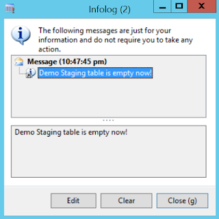 void clicked() { super(); delete_from demoTrans; info("Demo Staging table is empty now!"); } |