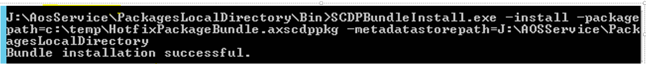 SCDPBundleInstall.exe -install -packagepath=c:\temp\HotfixPackageBundle.axscdppkg -metadatastorepath= J:\AOSService\PackagesLocalDirectory