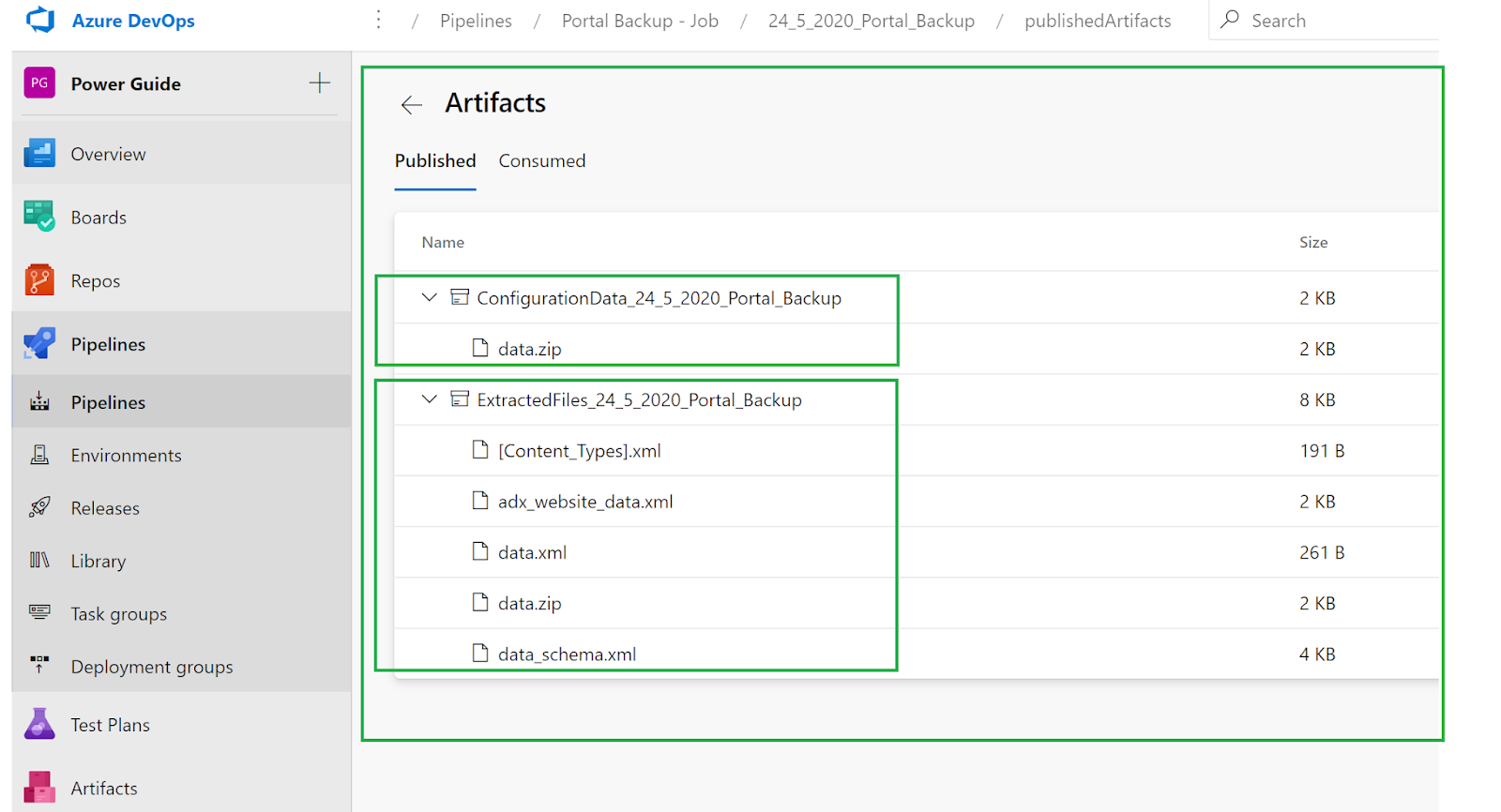 - To view the backup of your Portal Configuration, you need to open the Pipeline Job (Open the Build Pipeline > Go to Job Run > Click to Open the Job > Click on Artifacts) of a specific date or you can check it on your email. For Example: If I want to get the Backup of Portal Configuration taken on 24/05/2020, I need to open the Portal Backup Pipeline Job of 24_05_2020. That's why I have modified the Build Number format to Date Format so that developer can easily find/search the backup by backup date.