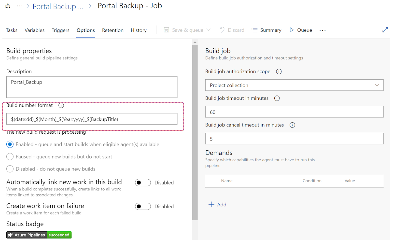 By default, Build Number shows a unique integer number for each running job like - #55, #56, #57, and so on. However, for readability purposes and find the Portal backup of a specific date, I have used the Build Job date as the Build number.