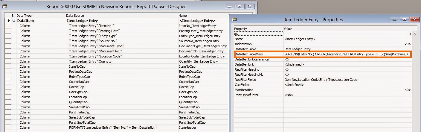 Below is a sample Report to have SumIF In Navision Report. The Report pulls data from Item ledger Entries and Show SumIF Of Sales and Purchase Quantities.