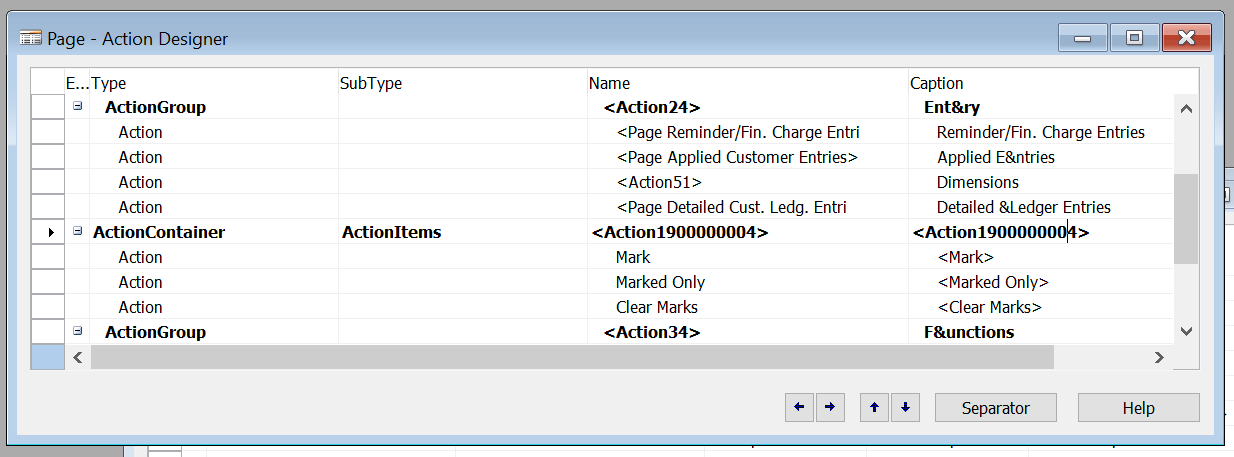 In order to add the buttons, I will open the Customer Ledger Entry page in the development environment and go to Action Designer