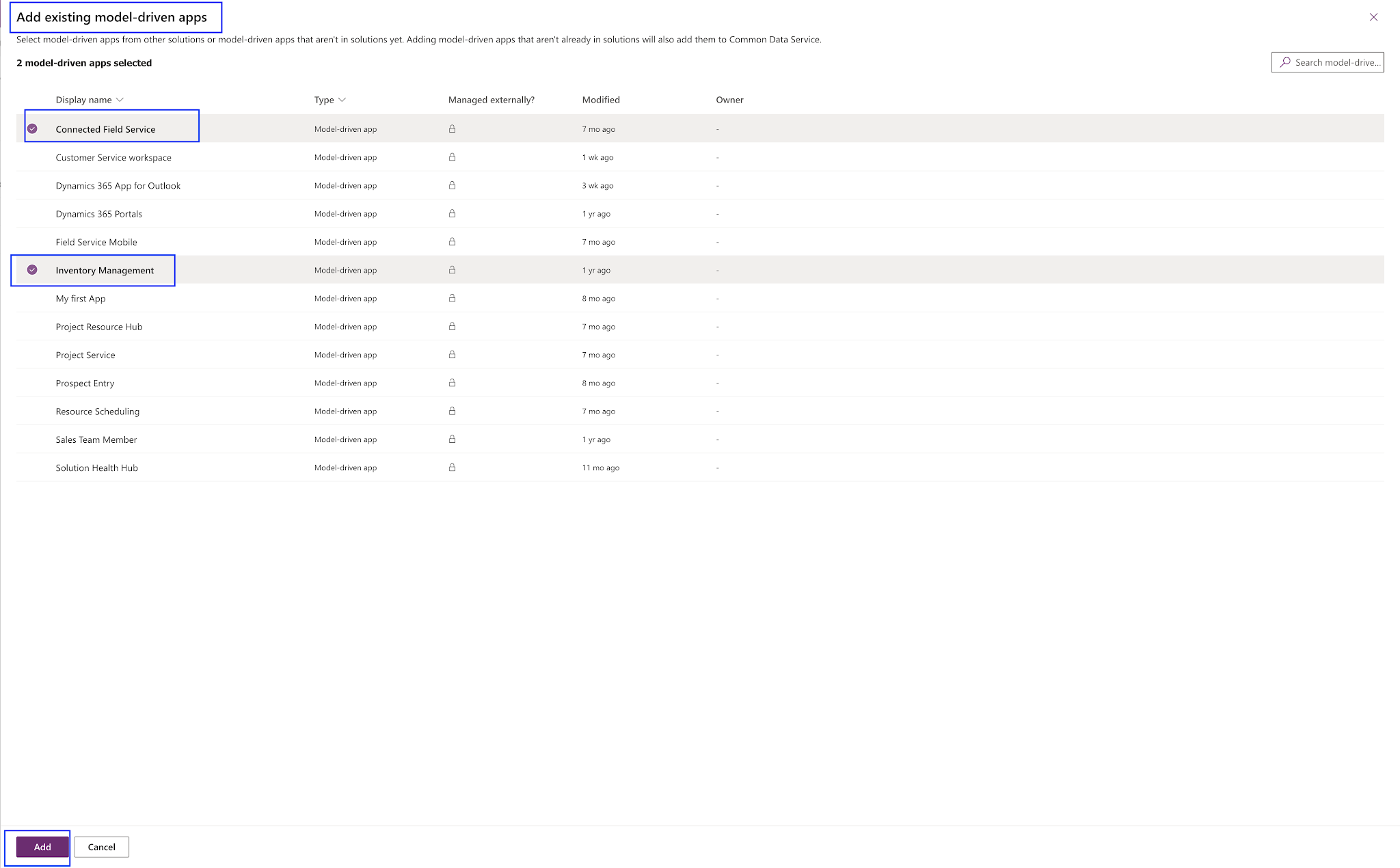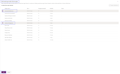 Then select the Model Driven Apps from the list of Apps and click add to the solution.