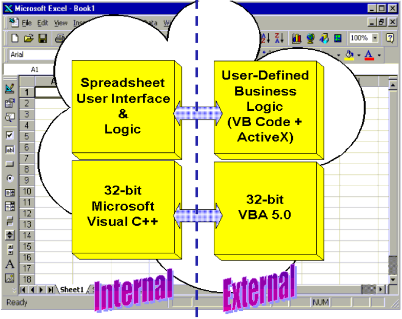 Note that the portion of the diagram to the left of the line represents the Microsoft “Internal” tools used to build Excel itself. To the right of the line represents the tools “External” users (i.e., end users) use to customize Excel.