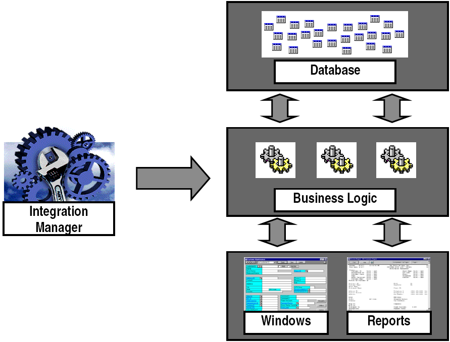 Integrating applications at the database level has become a very common approach. As the diagram shows, data is moved directly into the business management system’s database using integration standards such as Open Database Connectivity. This gives applications written in Access, Visual Basic, and PowerBuilder easy, standard ways of integrating at a data level. The Dynamics Import Utility also allows easy access to Dynamics tables: