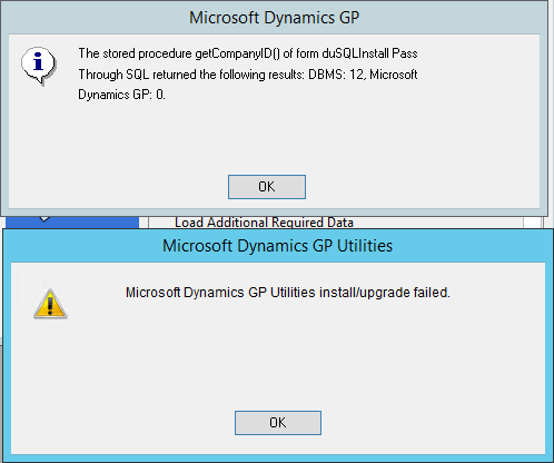 "The stored procedure UpdateDB_Upgrade() of form duSQL Pass Through SQL returned the following result: DMBS: 12, Microsoft Dynamics GP: 0."