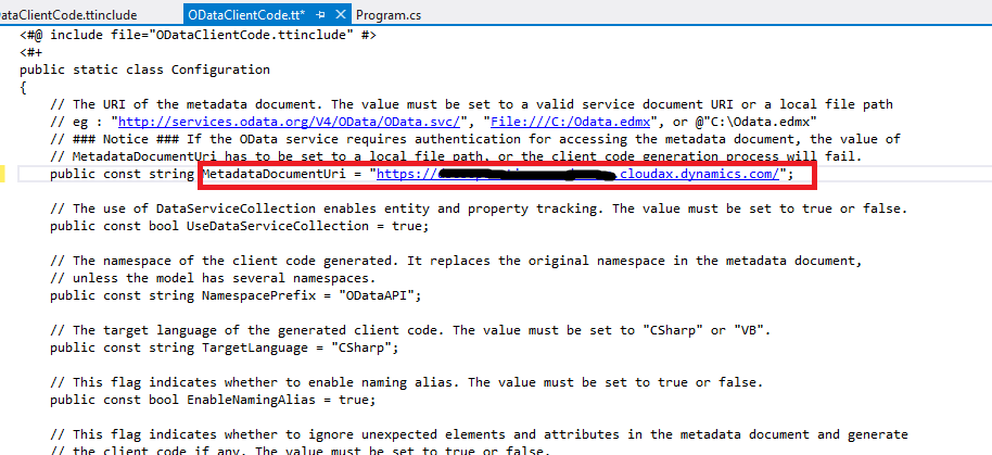 - You will see 2 files added in the solution. Open the file with .tt extension (Text Template). In the file, update the Metadata URI.