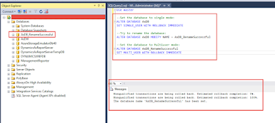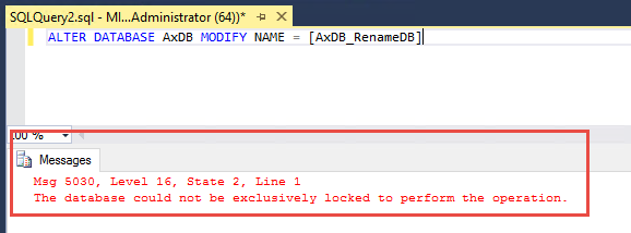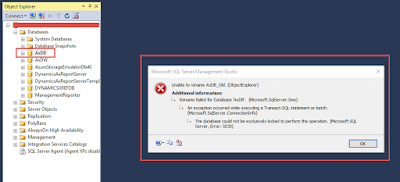 Recently I had a task to restore Microsoft Dynamics 365 database (AxDB), so for safe side I think I should keep my old database backup by only change it's name. When I done that error occurred that " Error: The database could not be exclusively locked to perform the operation" and it cannot let me rename the database as shown below.