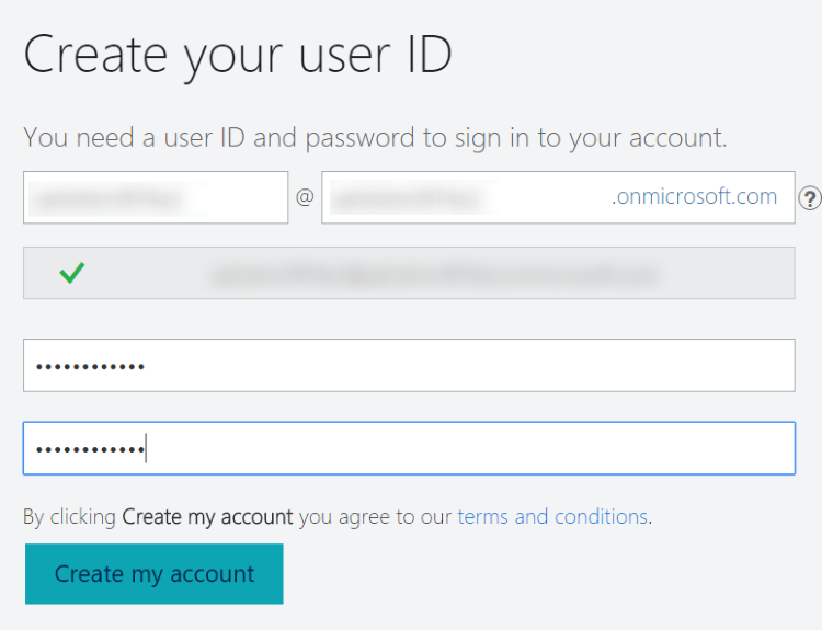 4) Select a username and password. These will be used to connect to Office 365 Portal and Dynamics 365. The first part of username before @ sign will be used to create the Dynamics 365 URL. Click on "Create my account".