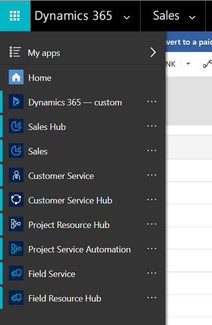 10) Click on arrow next to Dynamics 365 to view available apps as selected during setup. In my case, I have Dynamics 365 apps for Sales, Customer Service, Project Service and Field Service.