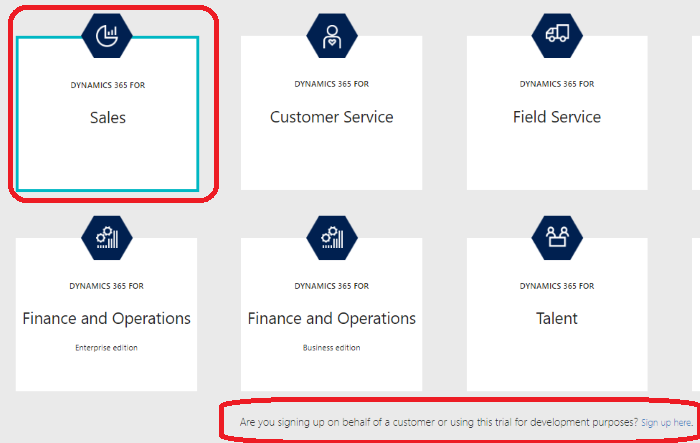 3) Select a relevant Dynamics 365 app. For example, I selected "Dynamics 365 for Sales". If you are creating this ORG in your company Office 365 tenant, enter your work email and phone number. I am creating a personal ORG for myself. Therefore, I will select "Sign up here".