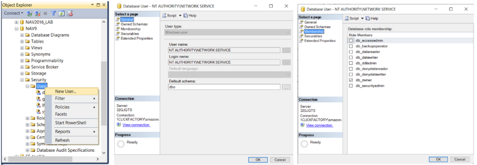 - In General Tab: add 'NT AUTHORITY\NETWORK SERVICE' as a new User name and Login name; Select dbo as Default schema