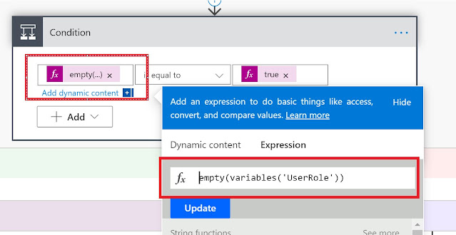 In the following example, I am Initializing a String Variable (UserRole) and in a later stage, I am setting a value in it. And in the Condition step (As shown below), I want to check whether this string variable contains data or not. If contains data or not null then proceed with Process A, else proceed with Process B