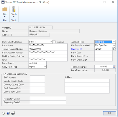 A client of us requested a consolidated report for all the vendor EFT Bank details, I was quite sure that I have come across an SQL Script on that matter, It was Ian's script | SQL view on Vendor EFT from Azurecurve. While it is just perfect, I still wanted further definitive details including most of the fields in the screen.