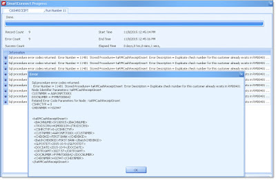 If you attempt to import a customer check number that already exists in GP, SmartConnect will spew this eConnect error at you.