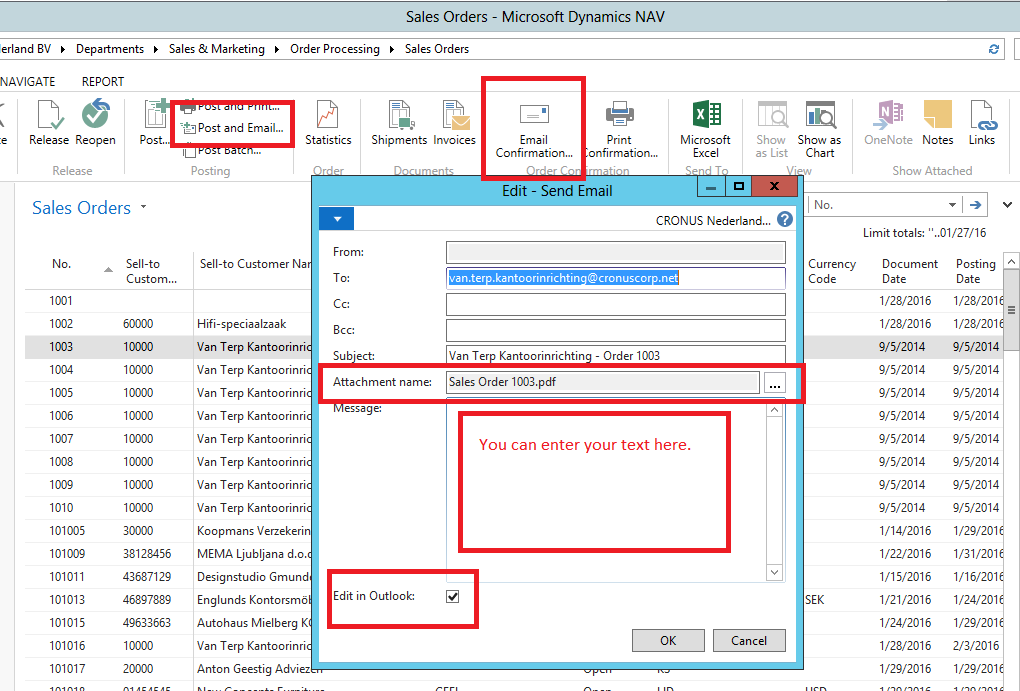 An option for sending attachments as email is available from, for example, sales invoices, sales credit memos, sales orders, sales quotes, reminders, and finance charge memos, as well as some posted documents.