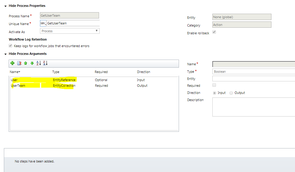 Working: - This workflow contains One Input parameter named User (System user lookup) and One Output parameter named UserTeam (Team EntityCollection)